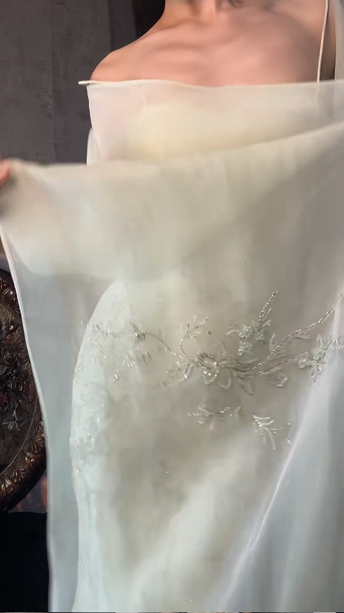 Classy Light Green Spaghetti Straps Tulle Beaded Mermaid Prom Dress Long Birthday Party Dress With Scarf SP1252