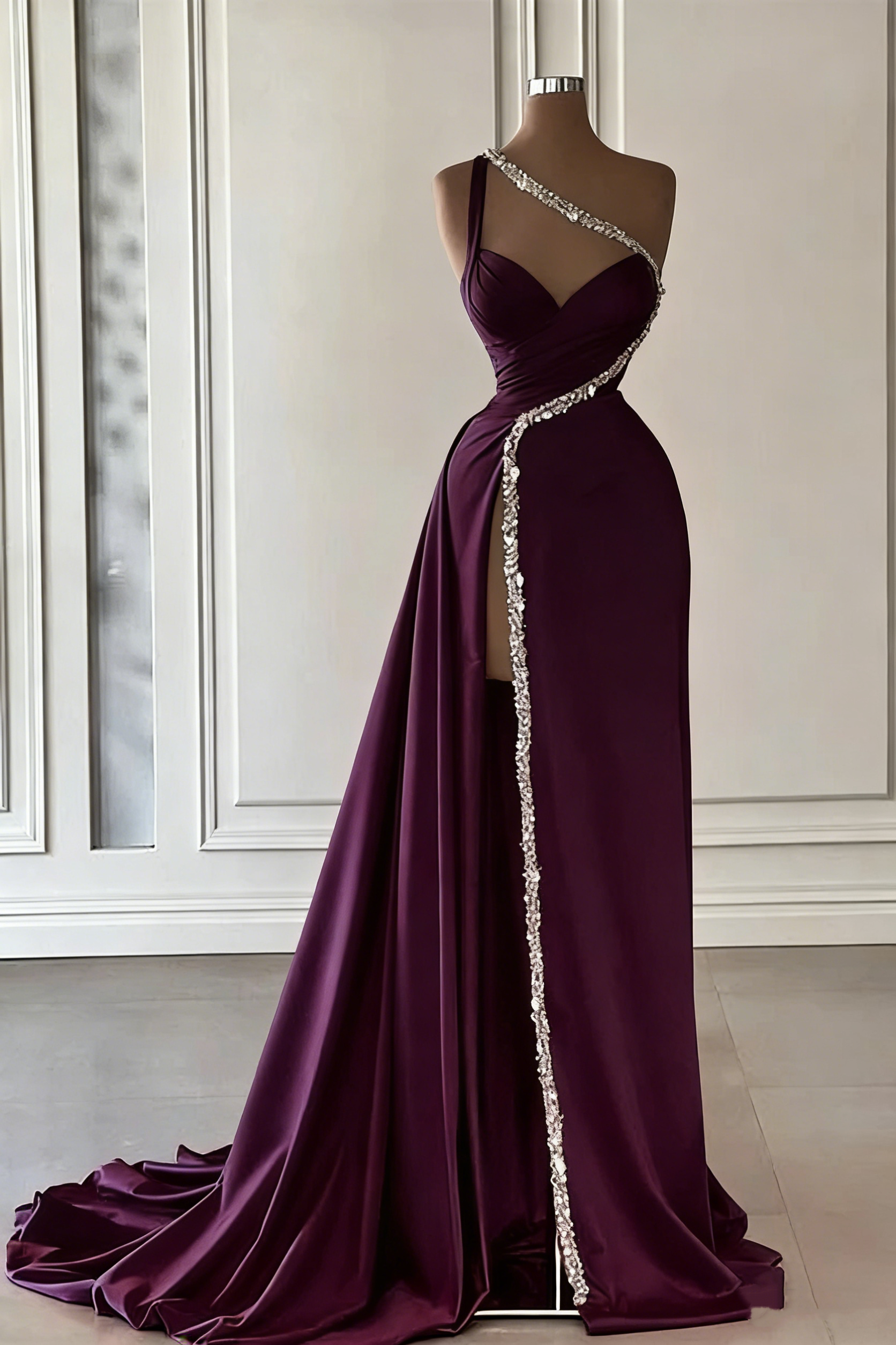 Gorgeous One Shoulder Hot Pink Satin Beaded Long Prom Dress Slit Evening Dress Y7692