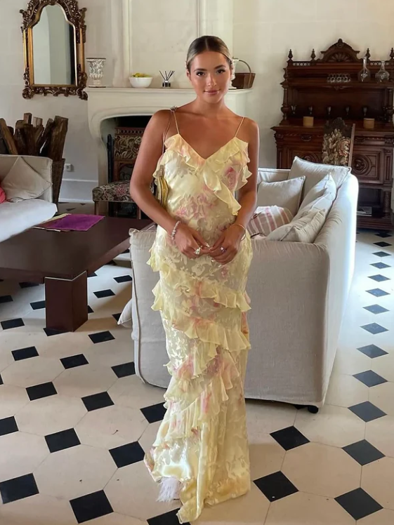 Romantic Spaghetti Straps V Neck Chiffon Print Prom Dress,Charming Evening Dress Y2306