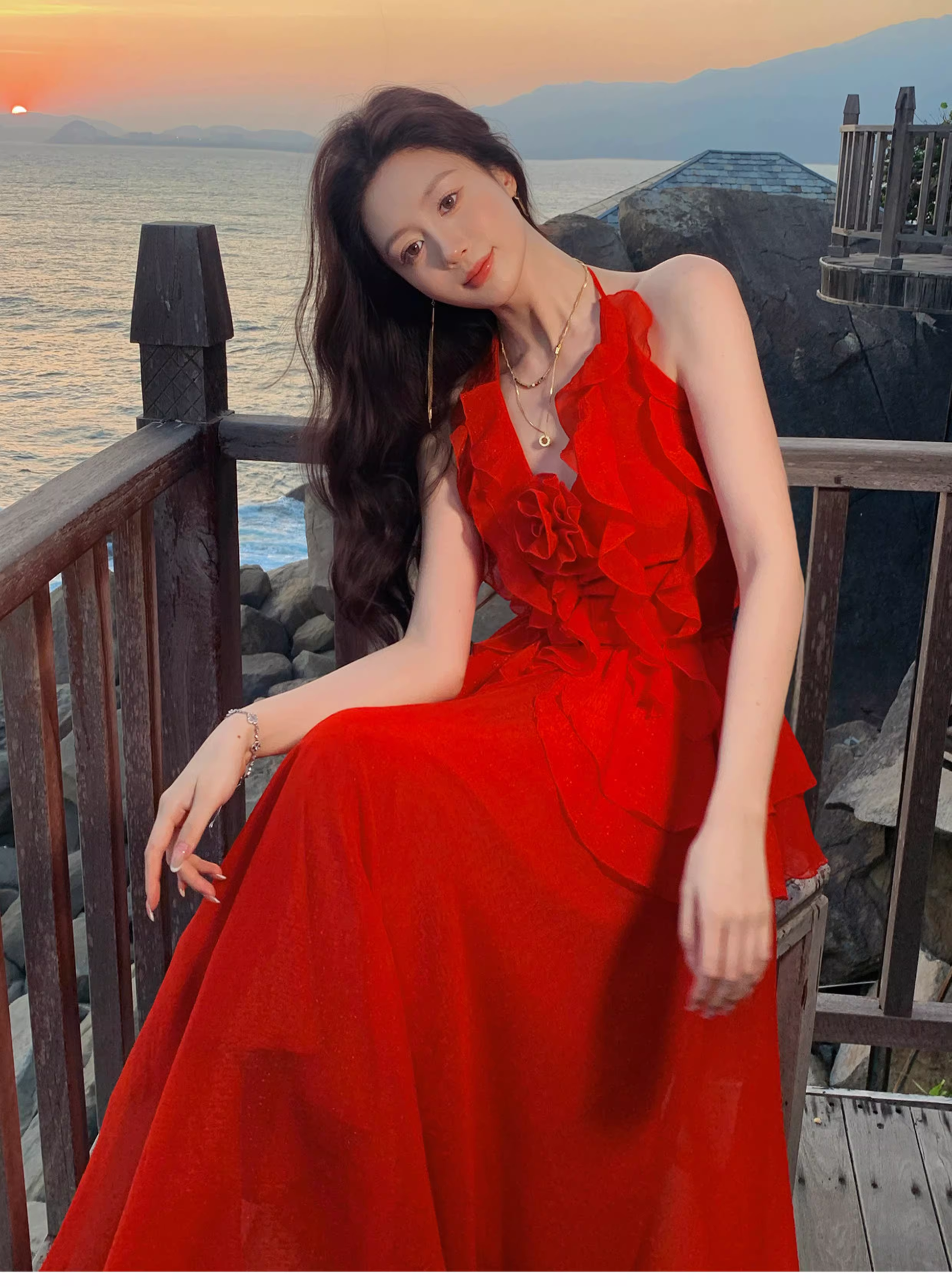 Sexy Red Halter Chiffon Ruffles Long Party Dress Prom Dress SP1973
